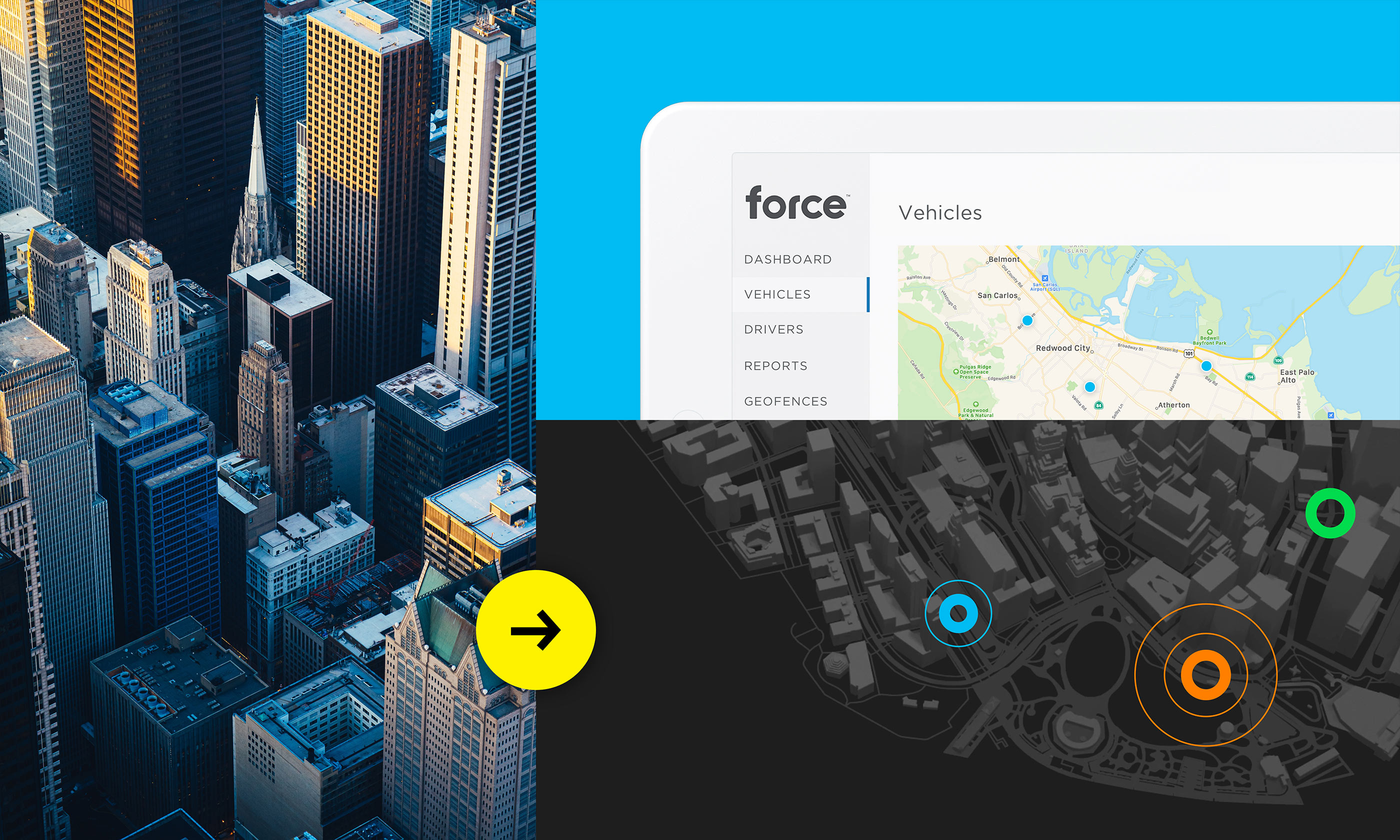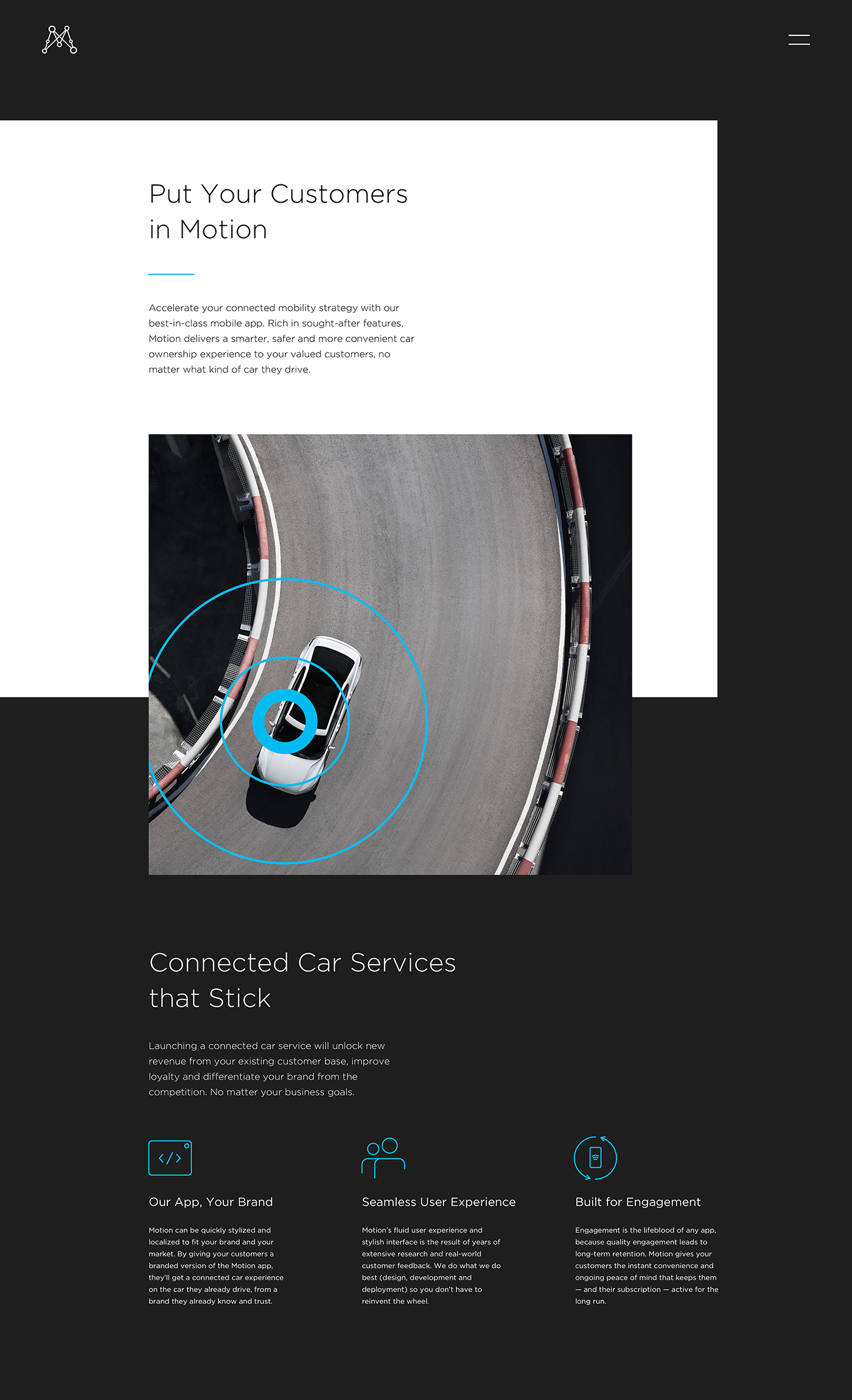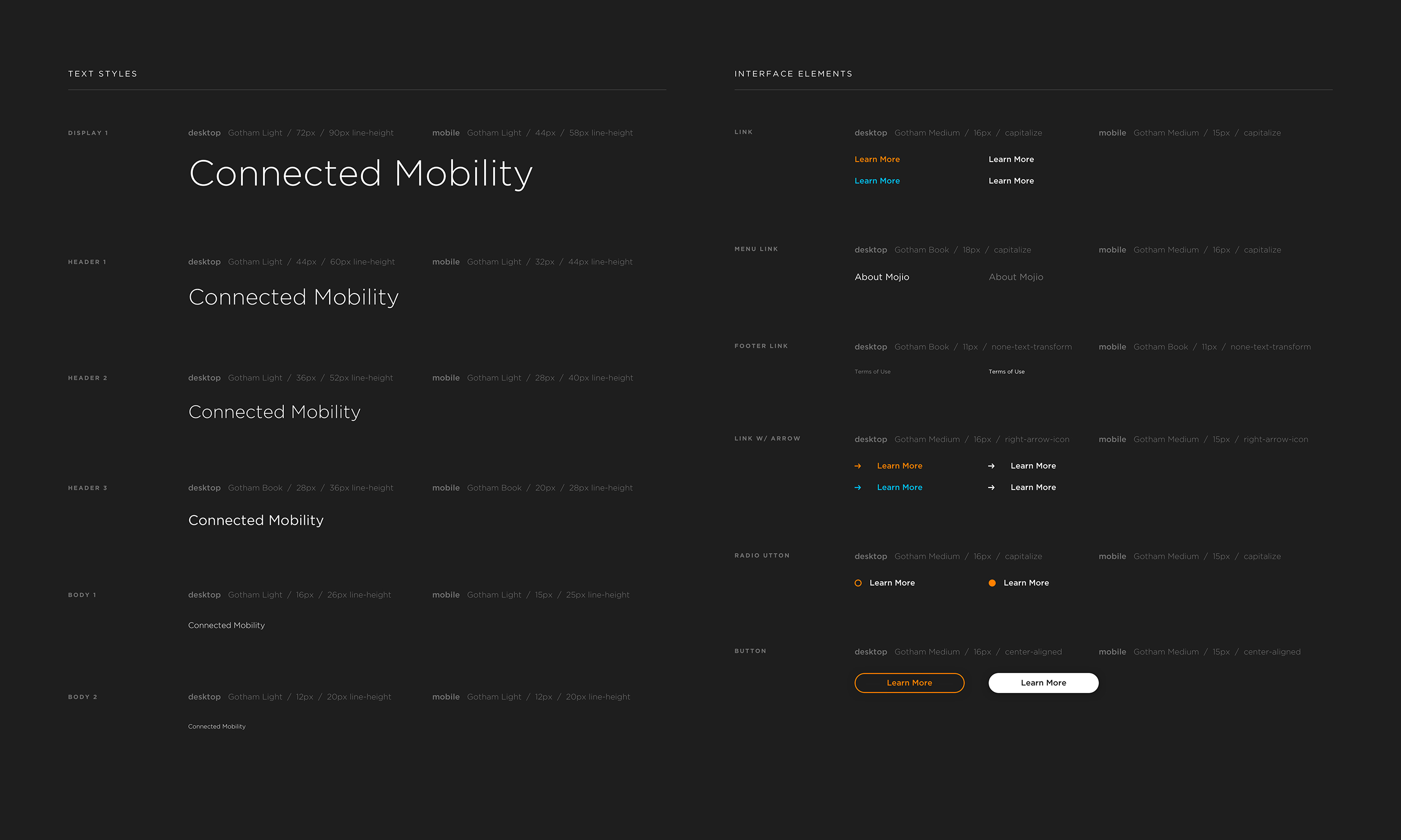 The previous Mojio site used gray backgrounds and gray colors on Gotham’s heavier weights, bringing down the overall contrast. I decided to use lighter weights of Gotham as it paired well with the more vibrant imagery. Each interface element makes use of the primary colors to draw attention.
